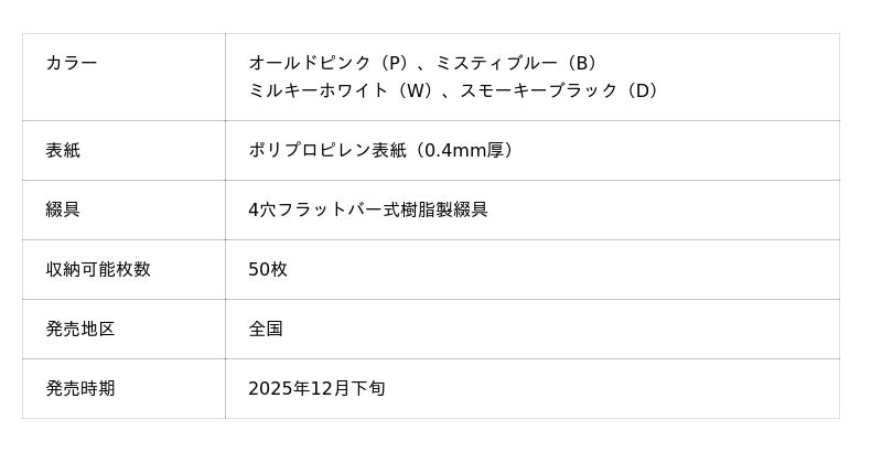 また、極限まで薄さを追求した綴具により収納枚数に合った背幅羽場での持ち運びが可能、かさばらないのでノート感覚でスマートに持ち運ぶことができます。