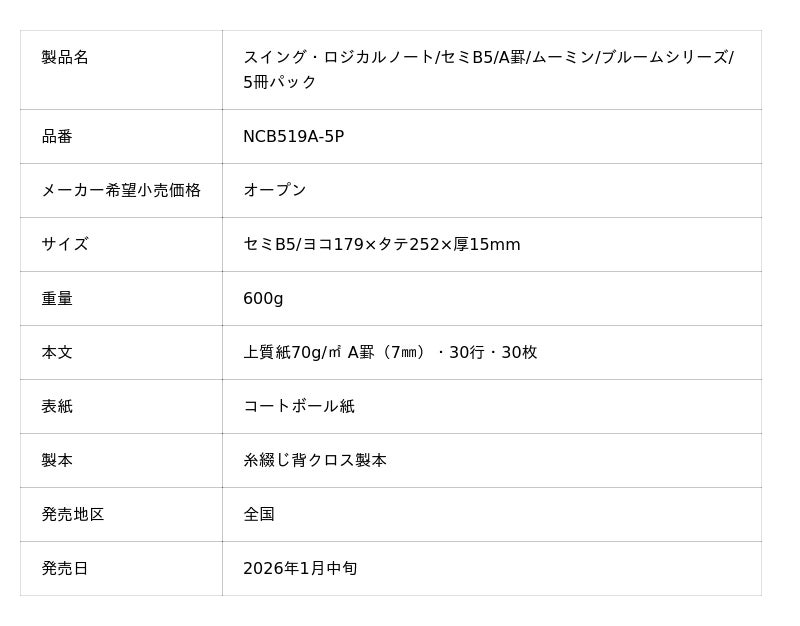ナカバヤシ株式会社(本社:大阪市中央区、社長:中林一良)は、ムーミンをデザインしたノート「スイング・ロジカルノート セミB5 ムーミン ブルームシリーズ 5冊パック」を全国で2026年1月中旬より順次発売いたします。