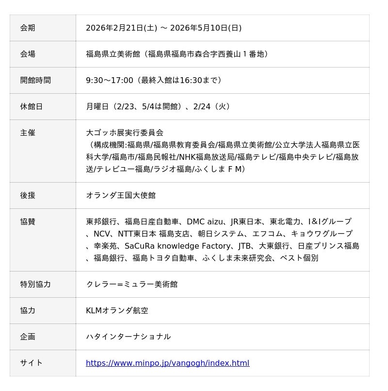 あわせて、大ゴッホ展には、NTT 東日本株式会社 福島支店(支店長:大橋 真孝、以下 「NTT東日本 福島支店」)が協賛として参画し、福島エリアでの更なる価値創造への貢献を図ります。
