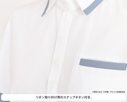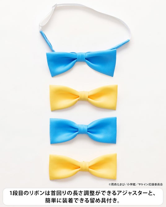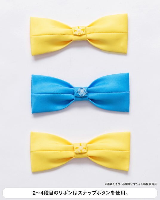 1段目の青いリボンはアジャスターつきのゴムで首周りに取り付け、2~4段目のリボンはスナップボタンでブラウスに取り付ける仕様に。