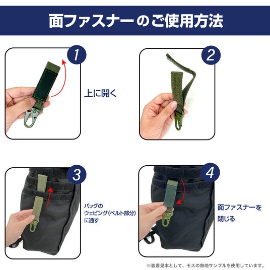 ・MOLLE(モール)システム対応。カラビナ金具と面ファスナー、それぞれで取り付け可能な2way仕様。