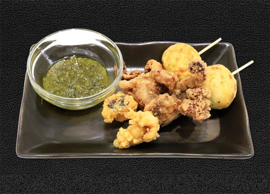 邪神クトゥルフをイメージしたタコとイカの串。不気味な色をしたチュミチュリソースは酸味と辛みのある魚介にあう味です。