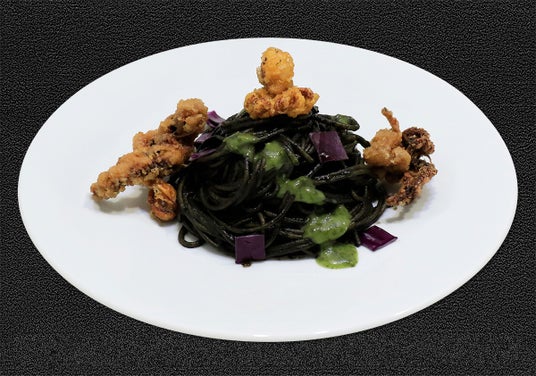 イカ墨トマトパスタ+イイダコ唐揚げ+イカゲソ唐揚げ+紫キャベツ+バジルソース