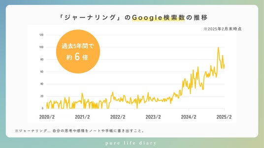 そんな中、手帳やノートを活用した「ジャーナリング」がストレス軽減や目標達成に有効な手段として注目を集めています。また、ジャーナリングのGoogle検索数は過去5年間で約6倍に増加し、コロナ禍によるストレス増加、メンタルケアの重要性の高まりをきっかけに、SNSを中心に広がっています。