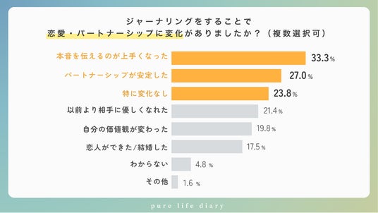 - ジャーナリング実践者の恋愛への影響1位は「本音を伝えるのが上手くなった」(33.3%)。