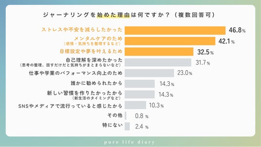 ジャーナリング経験者にジャーナリングを始めた理由を聞いたところ、1位は「ストレスや不安を減らしたかった」46.8%、次いで「メンタルケアのため(感情・持ちを整理するためなど)」42.1%、「目標設定や夢を叶えるため」32.5% という結果でした。
