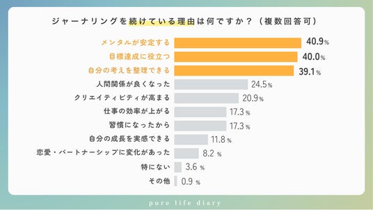 - ジャーナリングを続ける理由1位は「メンタルが安定する」(40.9%)。