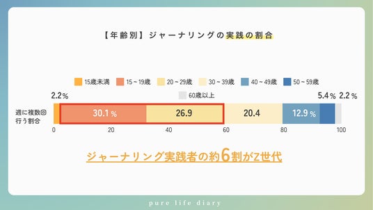 1週間のうちジャーナリングを複数回行うと答えた人は45.8%となり、そのうち、Z世代(15歳~29歳)の実施率は、実践者のうち約6割という結果でした。