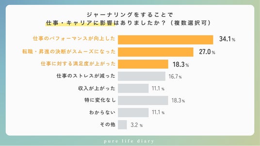 ジャーナリングを実践したことによる仕事やキャリアへの影響を聞いたところ、1位は「仕事のパフォーマンスが向上した」で34.1%、次いで「転職・昇進の決断がスムーズになった」で27.0%、「仕事に対する満足度が上がった」で18.3%でした。