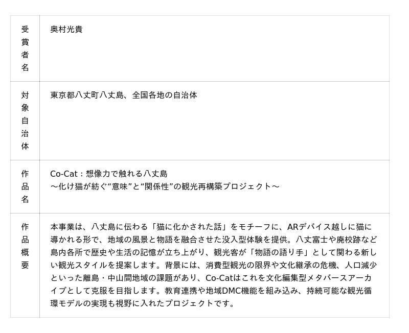 「地方創生メタバースアワード」は、人口減少や高齢化、地域経済の停滞といった地方自治体が抱える課題解決を目的に、最先端のメタバース技術とクリエイティブな発想を融合させた新たな地域活性化モデルを創出する取り組みです。デジタル空間を活用することで、地域の魅力をリアルに近い形で表現し、地理的・時間的制約を超えて国内外に広く発信することを可能にします。