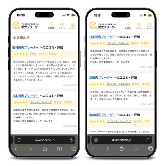 実際に子犬をお迎えした方からいただいた、”お客様の声”をご紹介する口コミ欄を追加しました。当サイトでは、掲載基準を満たした優良ブリーダーのみを登録していますが、そのなかでも、特に信頼できるブリーダーを探せます。